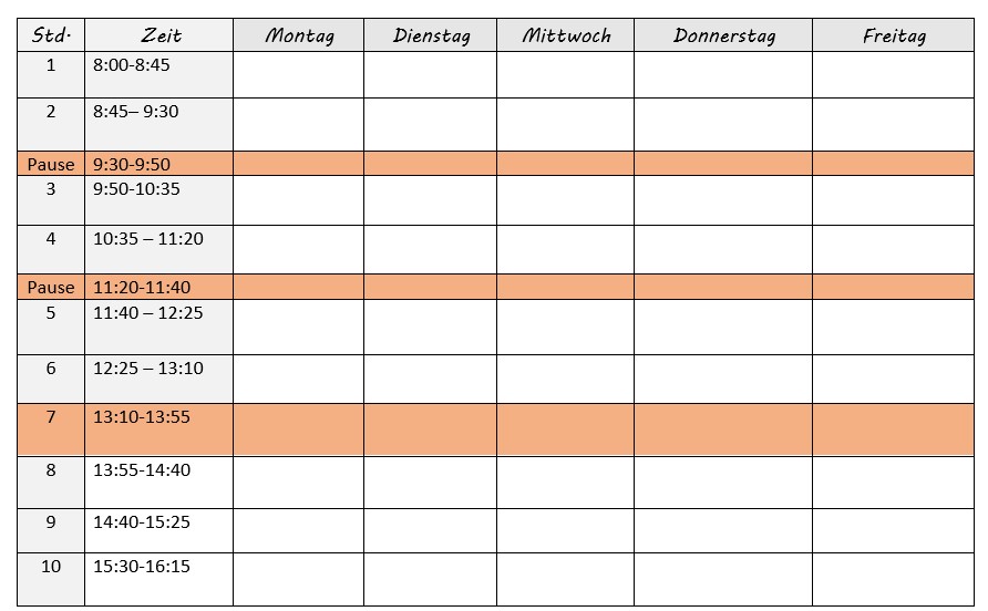 Stundenplan mit Pausen im Schuljahr 2025/26